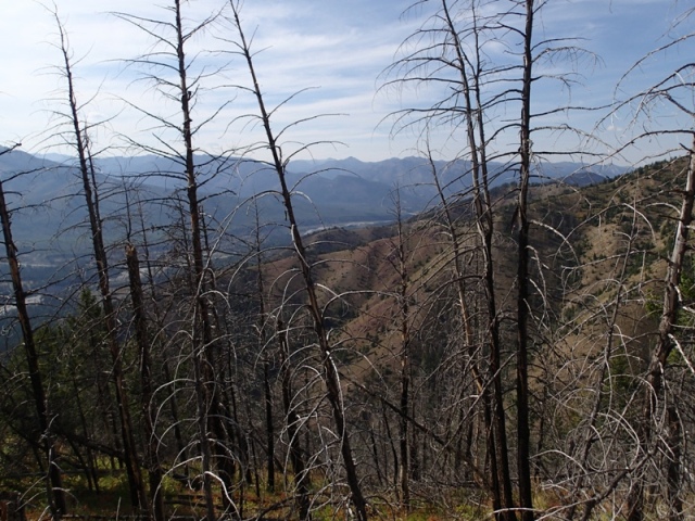 Before we leave, we take in the colossal view from near the top of the mountain. A wildfire flares up in the afternoon heat (mid 70’s) and low humidity. Since we entered this world-class wilderness, we have observed that the natural fire regime is ecologically intact here. There is a mosaic of different-aged burn patches mixed within an ocean of green . We actually are surprised at the sheer amount of the landscape that is in burn. Seems about like a ratio of 50 % burn, 50% not burned. Intact fire regimes are characteristic of large, untrammeled places where the footprint of people is minute and there are ecologically favorable land management policies . First and foremost, these are the places that we must preserve forever if we, as a nation, are going to save something natural, wild, and free for future generations-and for the conservation of biodiversity. We are pleased to be in one of these places.