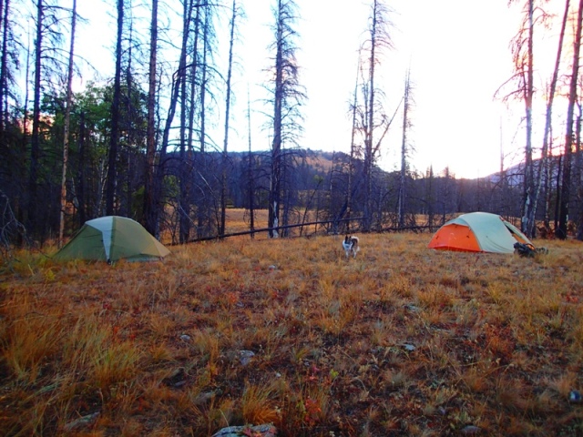 We awake at camp to a light frosting, ready to hike deeply into the Bob on Day 2. The weather is amazingly clear, cool and arid, a nice break from our usual sweltering, humid Florida heat. We walk westward along the West Fork Sun River all day. Leaving camp around 10 a.m. and hiking with frequent rests until 5 p.m. hits the sweet spot for our traveling needs. Vika has become our friendly and watchful companion. She eagerly assumes her natural bred role as watchdog and shepherd-corralling the Remote Spotters as we head toward those high mountains. We must eventually ascend up over the Continental Divide at White River Pass (elev. 7600 feet)-a climb of about 2200 feet in gained elevation. We plan to reach the base of the mountain spine today and do the ascent tomorrow.