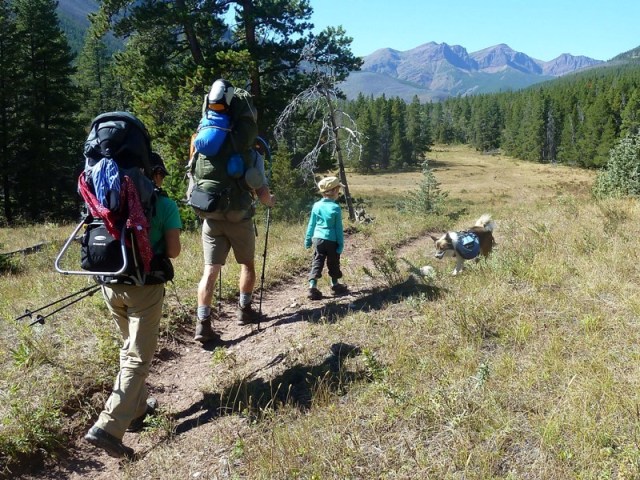 Despite getting a late afternoon start on our first hiking day around 3 p.m., we achieve 4.8 trail miles. We decide to make first camp on a grassy bench overlooking the Sun River. There are a few factors that go into finding a suitable camping spot in the wildereness while backpacking. Number one? Proximity to water. We have the Sun River. Check. Number two? Flat or at least flatish ground. Bench near river. Check. Number three? Timing. It is nice to have a spot picked out before sundown in order to give yourself time to enjoy the late afternoon and get all chores like pitching tent, pumping water, and dinner cooking, done before dark. Of course, timing is a preference thing depending on the mood of the traveler(s). Since we are traveling with a little girl who needs some play time and freedom outside riding in the backpack, timing is important for us. Our spirits soar in first camp. We are elated to have made good distance with such heavy loads on our backs this first day. No injuries. No blisters. Yet.